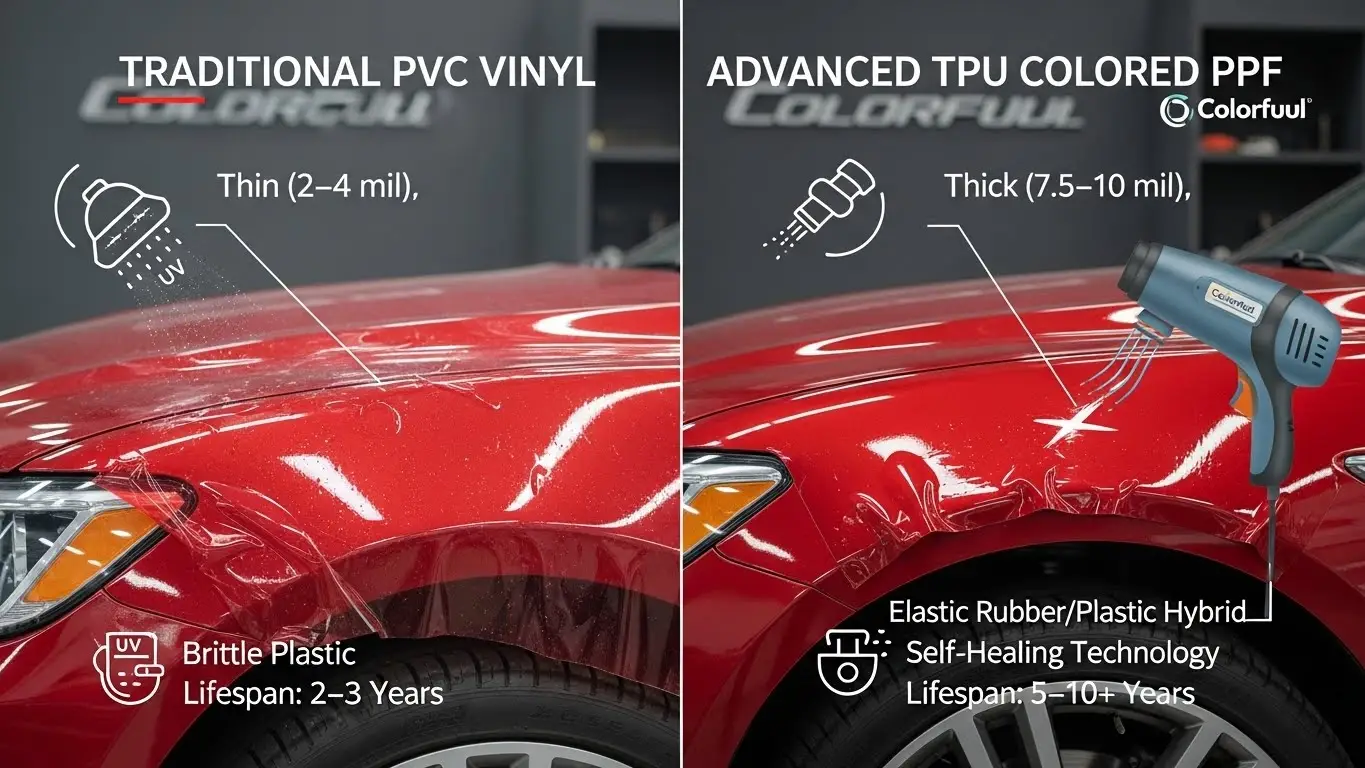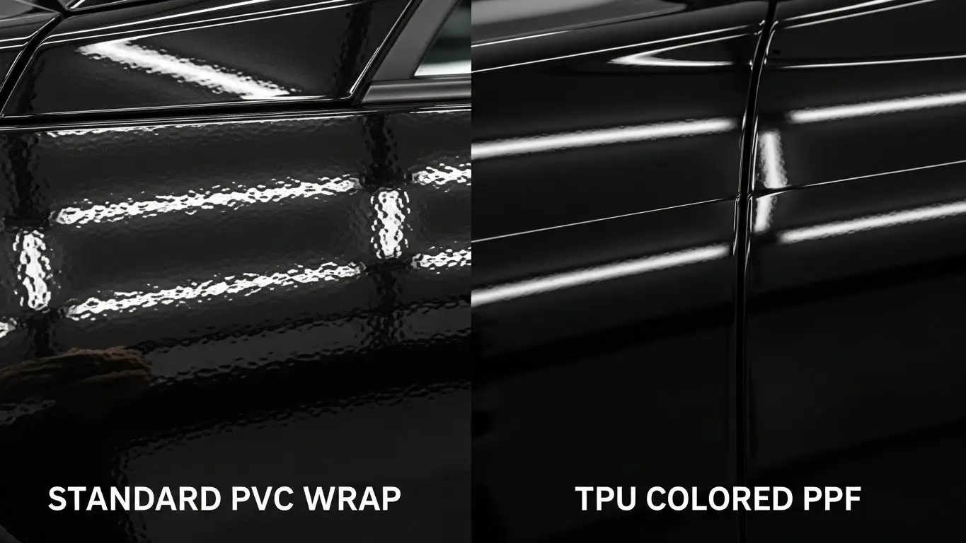 The main difference lies in durability and composition. PVC (Vinyl) is a rigid plastic that relies on added chemicals to stay flexible, typically lasting 2–3 years before cracking or fading. TPU (Colored PPF) is a naturally elastic, rubber-like material that offers self-healing properties, withstands rock chips, and lasts 5–10 years. While PVC is cheaper upfront ... Read more